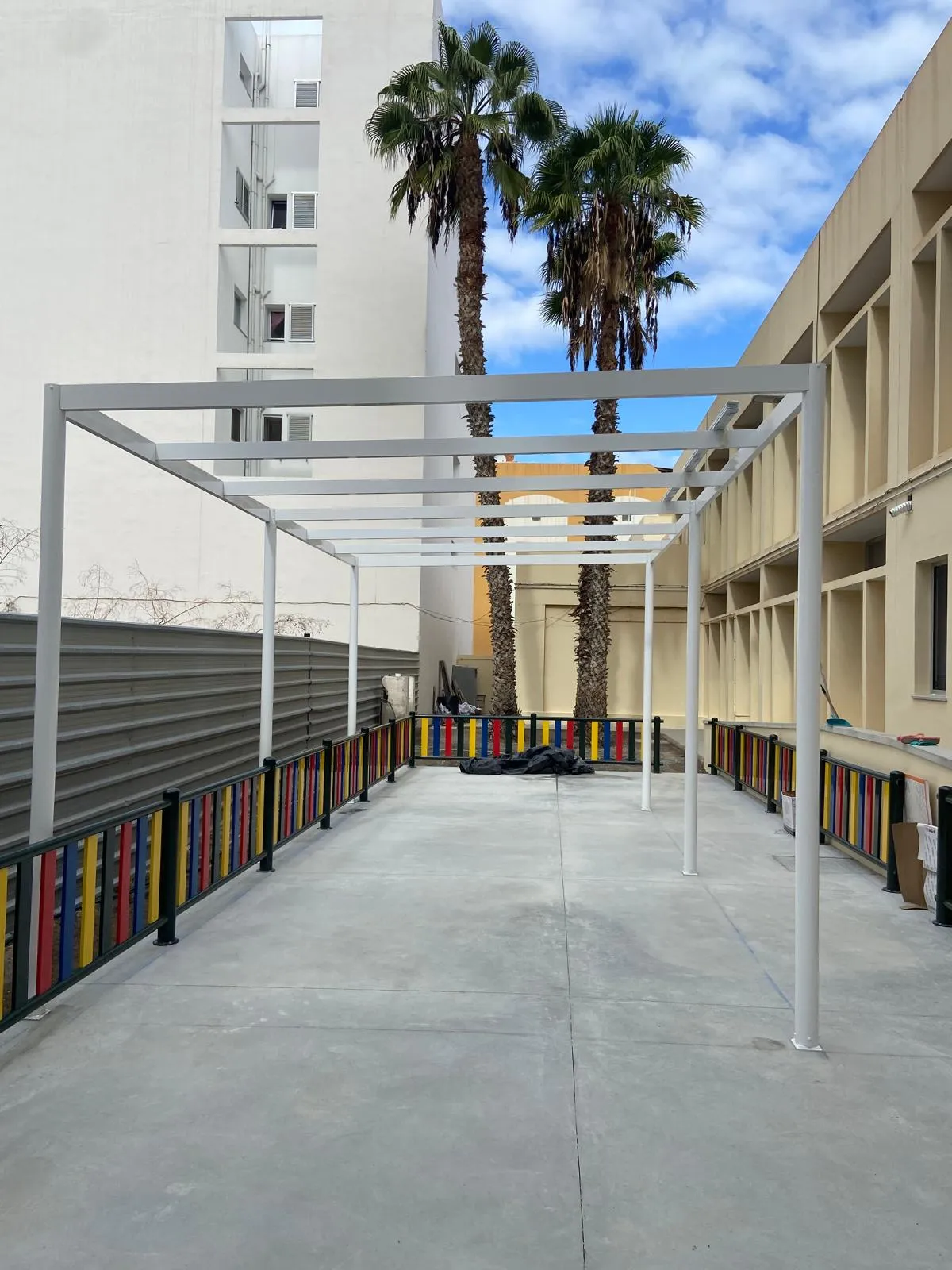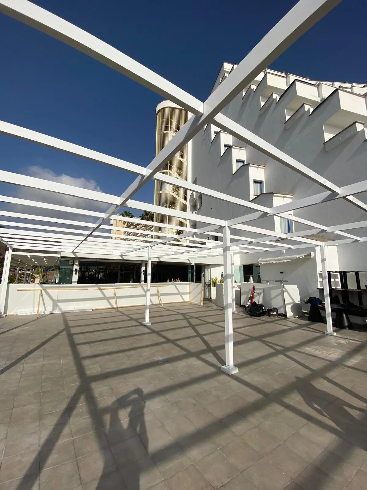 La estructura se diseña garantizando estabilidad, durabilidad y seguridad, con uniones atornilladas o soldadas según el proyecto. Las pérgolas pueden ser autoportantes o ancladas a fachada, con fijaciones mecánicas adecuadas al soporte existente (hormigón, forjado o estructura metálica).